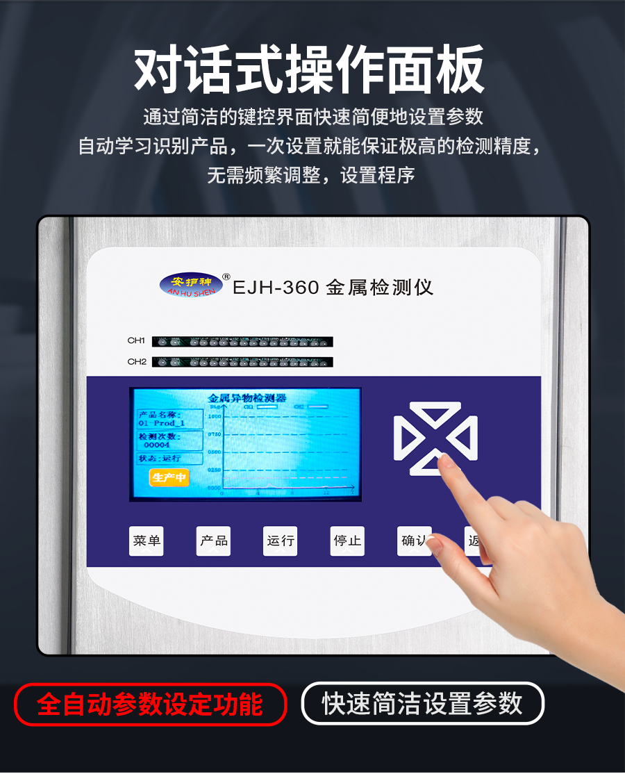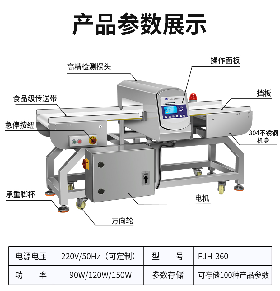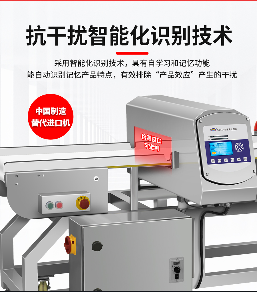 安護(hù)神EJH-360金屬檢測機(jī)采用先進(jìn)的雙信號(磁感+電導(dǎo))或多頻技術(shù),精準(zhǔn)檢測鐵、非鐵(如銅、鋁、不銹鋼)等各類金屬異物,靈敏度可達(dá)Fe 0.3mm, SUS 0.5mm (具體數(shù)值根據(jù)產(chǎn)品實(shí)際性能填寫),有效杜絕漏檢。獨(dú)特算法和屏蔽設(shè)計,有效抵抗產(chǎn)品效應(yīng)(濕、鹽、酸等)和環(huán)境干擾(振動、溫度波動),大幅降低誤報率,保障生產(chǎn)流暢性。配備氣動翻板、推桿、吹氣等多種快速響應(yīng)剔除機(jī)構(gòu),確保檢測到的含金屬產(chǎn)品被有效隔離,不影響合格品通過。 適用于肉禽水產(chǎn)加工、烘焙與糖果、乳制品、休閑零食、調(diào)味品與醬料、速凍食品、寵物食品、包裝材料進(jìn)料檢測等行業(yè)