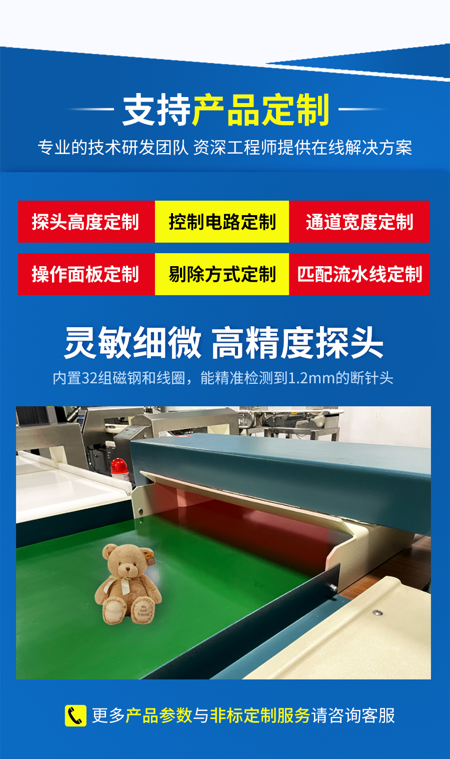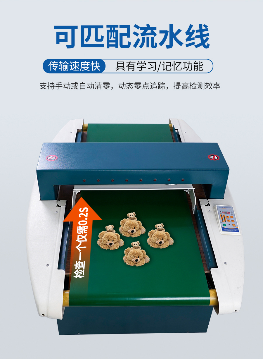 EJH-2高靈敏度抗干擾檢針機技術采用強抗干擾次世代數字電路,數字形態分析被檢測物體,對比傳統檢針機的性能,EJH-2檢針機性能具有較強抗干擾性和超高靈敏度。用于檢測夾雜、失落于紡織制品中的斷針(折斷的縫紉機針)、鐵絲等鐵磁性金屬(即所謂過檢針),避免給消費者和企業帶來直接或間接的損失,該產品也是出口產品制造商和原料供應商所必須具有的檢測設備,是企業質量標準的象征,可以更好的為企業接納更多的外貿訂單。 適用范圍 服裝、玩具、工藝品、地毯或無紡布巾等需要檢測鐵磁性金屬雜質檢出的行業