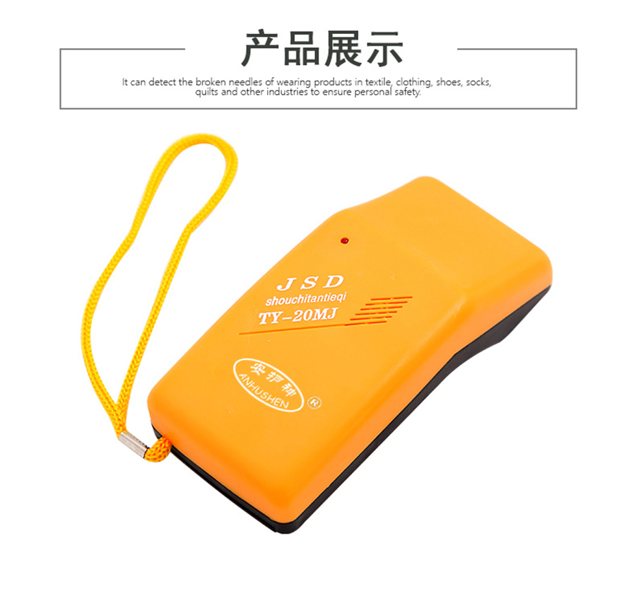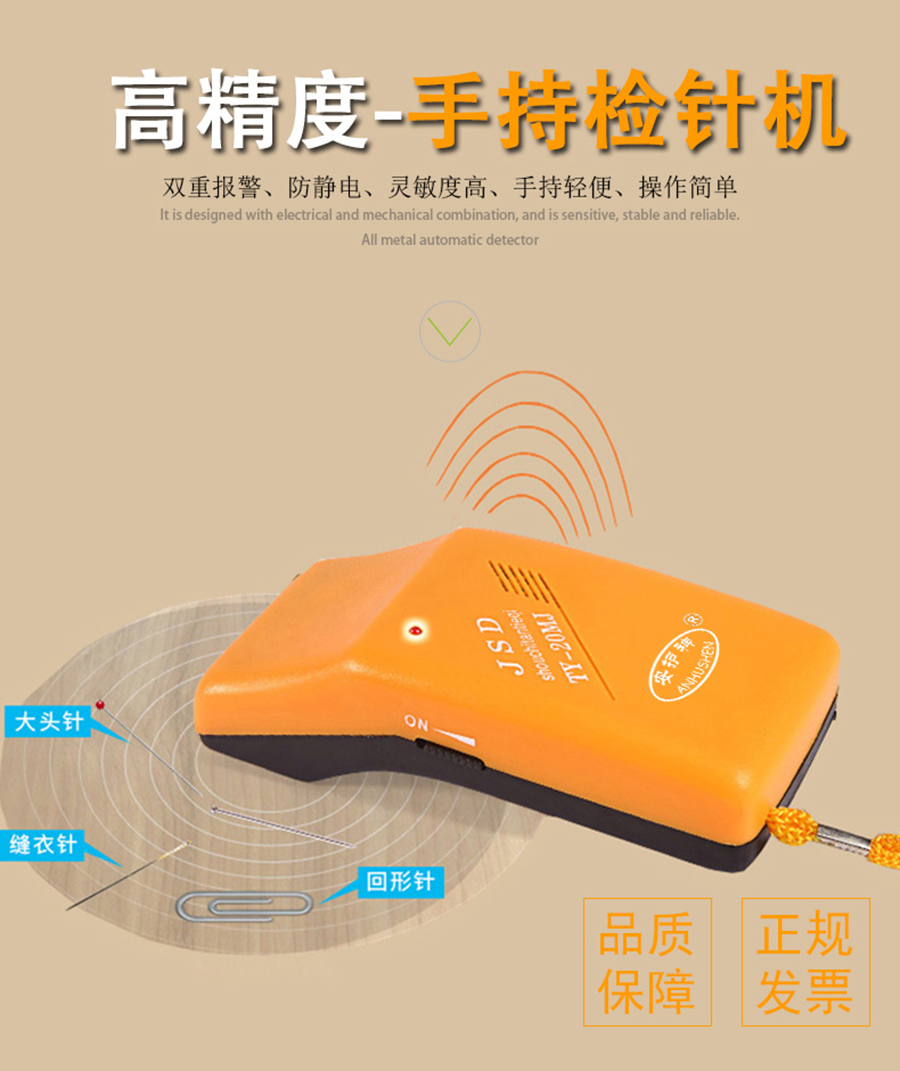 安護神TY-20手持檢針機替代傳統大型檢針機,小巧機身可靈活檢測縫線、夾層等死角,能快速檢測衣物、鞋帽中的殘留斷針,避免出口質檢不合格,確保毛絨玩具、嬰兒用品無金屬殘留,符合安全標準,聲光雙報警模式,嘈雜車間也能清晰提示,杜絕漏檢